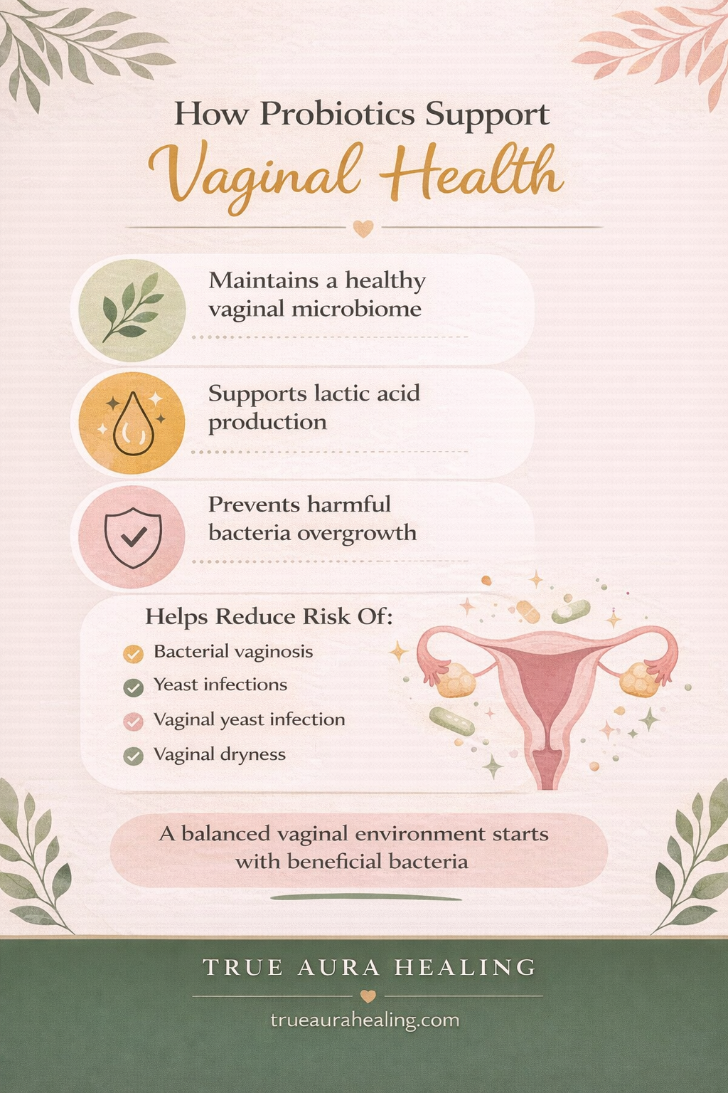 Infographic on how probiotics support vaginal health by maintaining the vaginal microbiome and reducing risk of bacterial vaginosis and yeast infections.