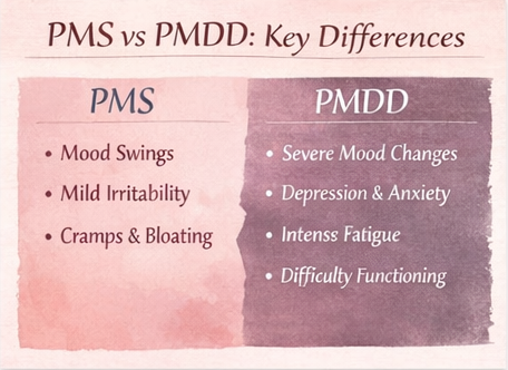 Hormonal health infographic showing how PMS and PMDD differ in symptom severity including mood changes, fatigue, and daily functioning.