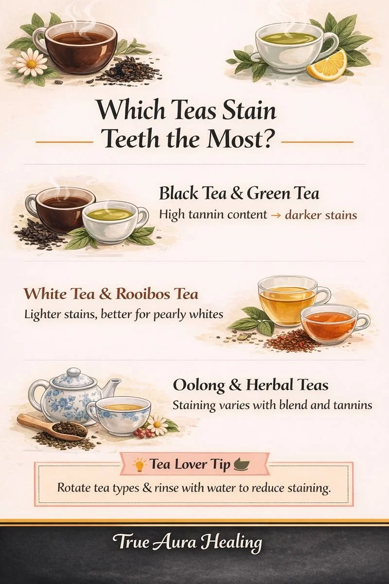 Wondering which teas stain teeth the most? This infographic breaks down how black tea and green tea with high tannin content cause darker tea stains, while white tea and rooibos tea are lighter options for protecting your smile. Learn how different blends affect staining and simple ways to reduce discoloration with smarter tea choices.